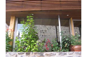 La fine structure bois, ainsi que le vitrage du hall, tendent � optimiser la l�g�ret� du nouveau volume. Ce �soul�vement du sol� �merge derri�re une jardini�re en pierre, sorte de socle massif et rustique, qui assure la continuit� du b�ti existant.