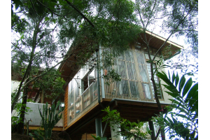 C�est une maison � moins de 90 000 euros pour un couple et ces 2 enfants sur un terrain en pente de plus de 25%. Elle s�installe en profitant des accalmies de la pente, s�oriente selon les vues et l'exposition. Le climat favorable permet d�organiser les pi�ces en module autour d�un s�jour central semi ext�rieur. La maison s'inspire des maisons coloniales : fabrication en atelier et livraison brute, optimisation des surfaces, ossature bois sur pilotis, bardage clins bois, ventilation traversante (baie libre+jalousie), distribution centralis�e, pi�ces techniques � l�ext�rieur, (salle d�eau). La maison profite des couverts v�g�taux et vents dominants. Seuls l'ouest et le toit sont isol�s.