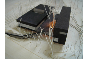 Le plate-forme;"un plissement de bois br�l� m�l� � la v�g�tation", r�unit quatre maisons dans la m�me structure architecturale. Cette pliure g�n�re deux typologies de logements sur les faces nord et sud:des T4 �troits et verticaux en R+1 et des T5 larges et horizontaux. Le centre, laiss� libre, devient un grand patio, lieu de convivialit� et espace plurifonctionnel partag� par chaque famille. Le rapport � l'environnement est ici primordial. Des bouleaux, choisis pour leur bois clair et leur feuillage tr�s a�rien, contrastent avec le bois tr�s fonc� des constructions. Le d�gagement de la plate-forme permet d'abriter les voitures.