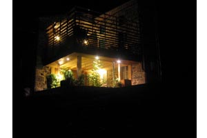 La fine structure bois, ainsi que le vitrage du hall, tendent � optimiser la l�g�ret� du nouveau volume. Ce �soul�vement du sol� �merge derri�re une jardini�re en pierre, sorte de socle massif et rustique, qui assure la continuit� du b�ti existant.