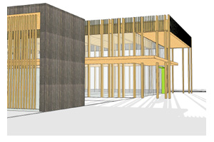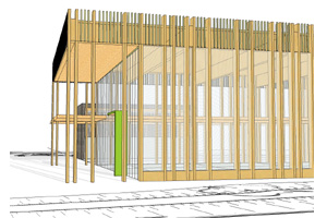 Cet ouvrage abritant les bureaux et les ateliers d'une soci�t� de N�goce de Bois de charpente et de menuiserie est implant� � la lisi�re d'une ch�naie parsem�e ponctuellement de quelques pins et de cypr�s. Cette architecture est une ossature bois �cologiquement engag�e. Le bois est ici mis en oeuvre pour r�v�ler la dimension verticale de la croissance naturelle d'une for�t et s'ins�re harmonieusement avec l'environnement. L'alternance des bois structurels et des panneaux de polycarbonate donne � lire un p�rystyle de f�ts de bois tel un volume-filtre.