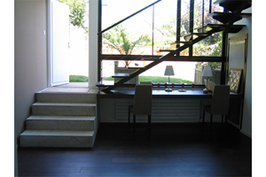 Ce projet, invisible depuis la rue, est un v�ritable � entre deux�. Il permet une meilleure communication entre, les espaces de vie, situ�s au niveau 1 et le jardin. Le volume est enti�rement praticable (toits terrasses), offrant ainsi un prolongement de l�int�rieur vers l�ext�rieur. En encastrant le projet de 75 cm nous mettons la tablette de bureau au niveau du sol ext�rieur. Cet ancrage permet l�habitabilit� de ces espaces et une plus grande communication, notamment visuelle, de l�individu et de son environnement v�g�tal. Ce petit �crin renferme en niveau haut, l�extension du salon et en niveau bas, un espace multim�dias biblioth�que, une chambre son dressing et sa salle de bain. Sa forme rationnelle permet l�optimisation hab& des r�glementations urbaines. L�extension insuffle une nouvelle vie � cette maison : dissociation de �l�espace parent� et de �l�espace enfant�, nouveaux usages et une r�elle ouverture sur l�ext�rieur.