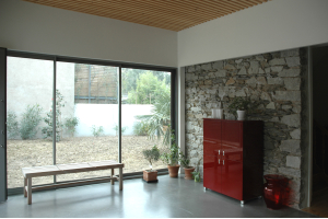 Extension d'une maison individuelle comprenant une chambre-bureau suppl�mentaire, un salon, un garage et des locaux annexes : chaufferie, cellier et local v�los. L'ensemble, volontairement introverti vue sa situation en milieu urbain, s'organise derri�re la r�interpr�tation du mur de cl�ture existant. Le garage-jardin d'hiver ouvert vers le ciel et en perspective sur le jardin, cr�e le lien int�rieur ext�rieur entre la maison et ses annexes. Des panneaux coulissants en panneaux composites permettent d'occulter le salon et recomposent une fa�ade du jardin int�rieur � la mani�re d'un patio. Le volume de la chambre �merge verticalement et affirme sa modernit� par son bardage de tasseaux bois.