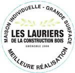 Ossature bois, bardage : pin douglas purg� d'aubier non trait� (�tage) et panneaux composites Max Exterior (Rez-de-chauss�e).