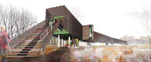 Structure: cadres en bois (type KLH)de forme variable tous les 1,25m pos�s sur 2 HEA longitudinaux port�s par des piles acier/b�ton tous les 12/15m pour un minimum impact au sol