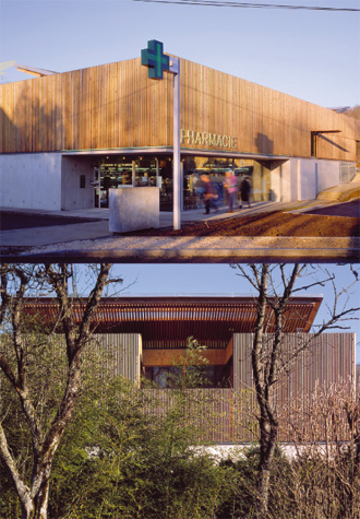 - Etage : murs ossature bois, toiture en dalles bois posées sur chant à claire-voie, toiture végétalisée, bardage lattes de mélèze sans finition.